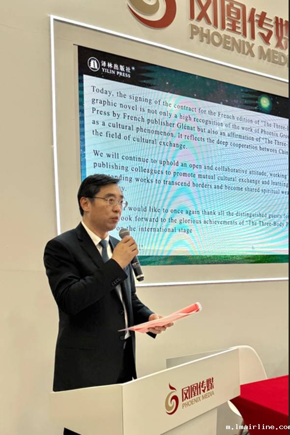 在签约仪式上,译林出版社副总编辑季钰作为中方签约代表致辞。她详细介绍了译林出版社独具特色的幻想文学产品线——“译林幻”系列的创立背景与发展历程,并指出“将优秀的中国科幻作品推向更广泛的国内外读者群体,是译林出版社未来发展的关键战略方向,而《三体》图像小说的出版工程无疑是这一战略布局的核心项目”。她进一步强调,《三体》图像小说的出版不仅是对经典IP的创新性改编,更是推动中国科幻文学走向世界舞台的重要一步。季钰对法国格莱纳出版社表达了诚挚的感谢。她还提到,格莱纳出版社为中国科幻文学与国际出版市场的深度对接搭建了桥梁,其专业水准和国际影响力将为《三体》图像小说在法国乃至欧洲的传播提供有力保障。